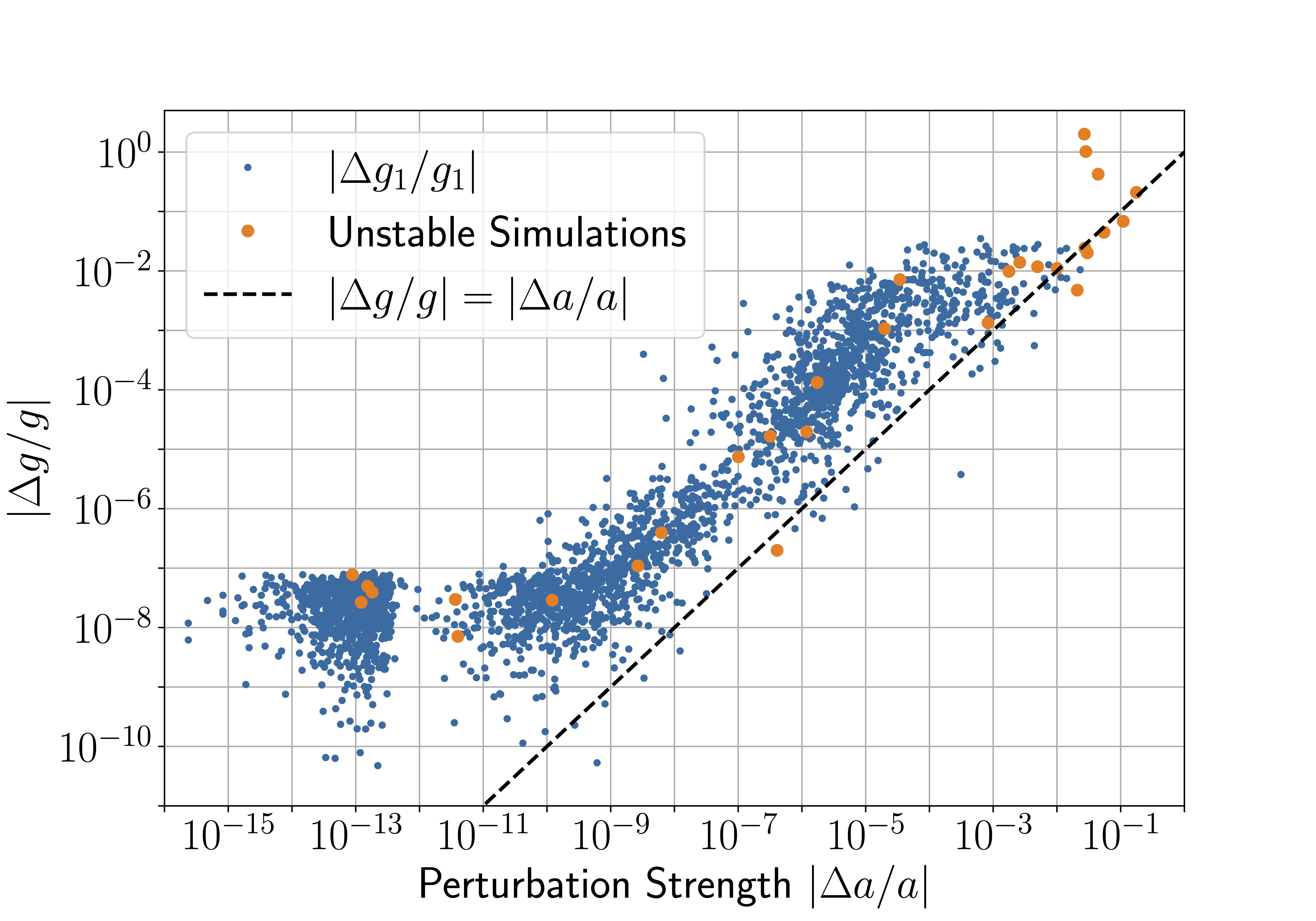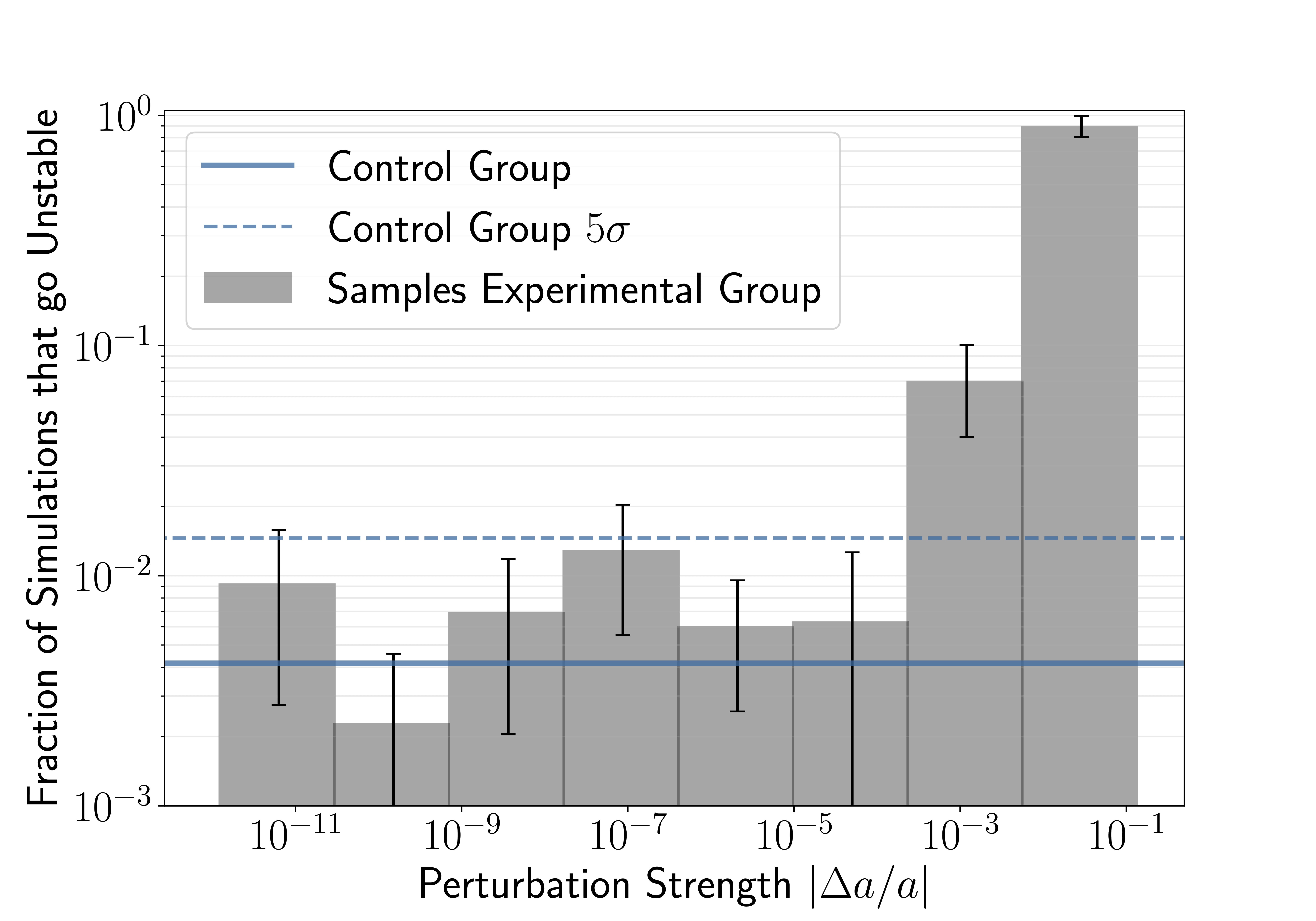 We found that the solar system is in a robustly stable region of parameter space. Without any external influences, there is about a 1% chance of instability before the death of the Sun ~5 billion years from now. 4 5 We divided our ensemble of simulations into a control group (N = 960) and an experimental group (N = 1920). After 4.8 Gyrs, the control group had 4 instabilities (~0.42%) and the experimental group had 26 instabilities (~1.35%). However, when divided over perturbation strengths, the experimental group shows a significant difference in the fraction of instability for relative changes larger than 0.1%, see Figure 1. A change to the semi-major axis of Neptune of just 0.1% increases the chance of instability by more than 10 times.