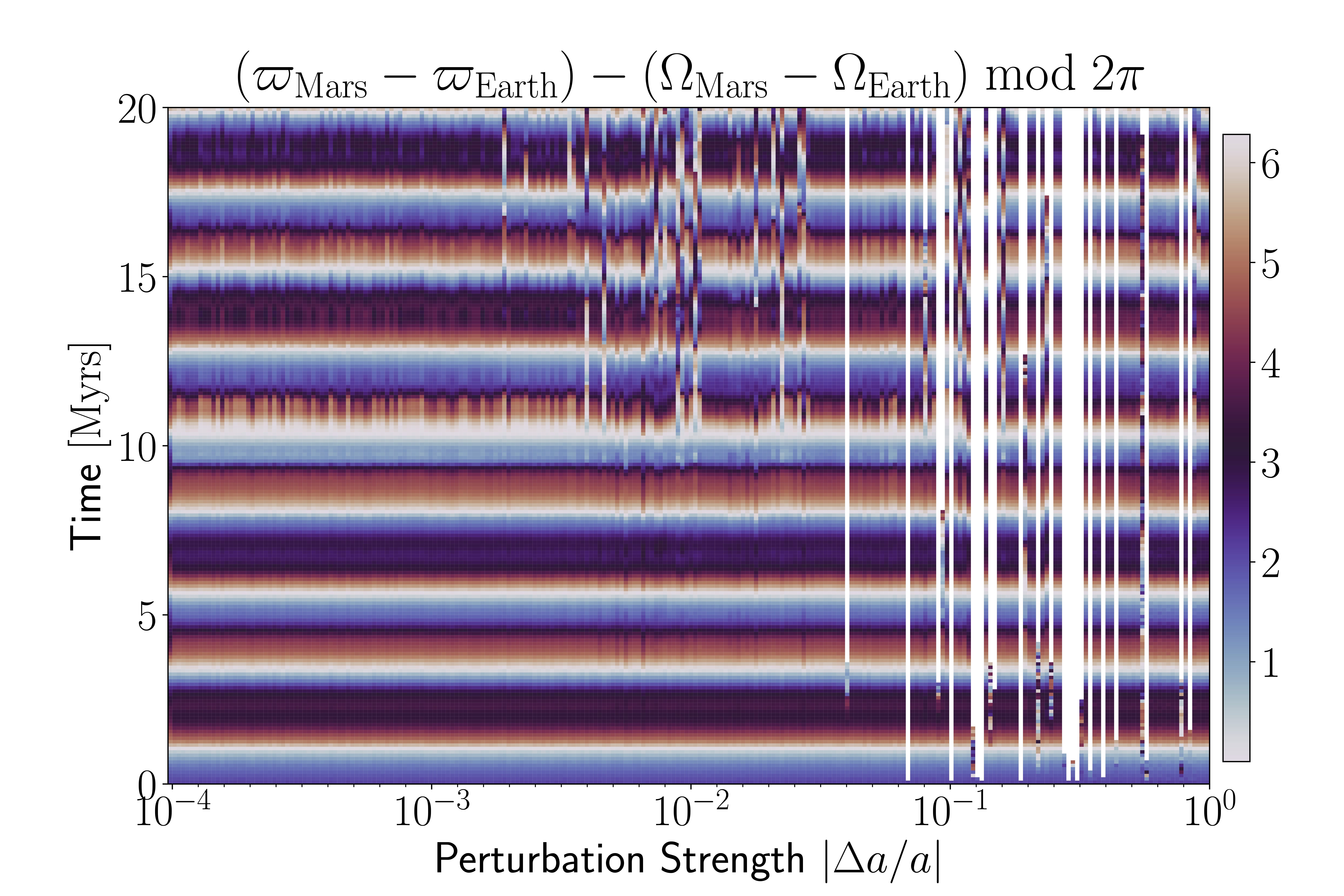 If the changes to the system are large enough, secular resonances could occur on relatively short timescales. This is especially true for planets which are already close to resonance like Mercury and Jupiter, but more especially Earth and Mars. Figure 4 shows how artificial alterations to the orbit of Neptune directly affect the secular structure of the solar system and its dynamical stability.